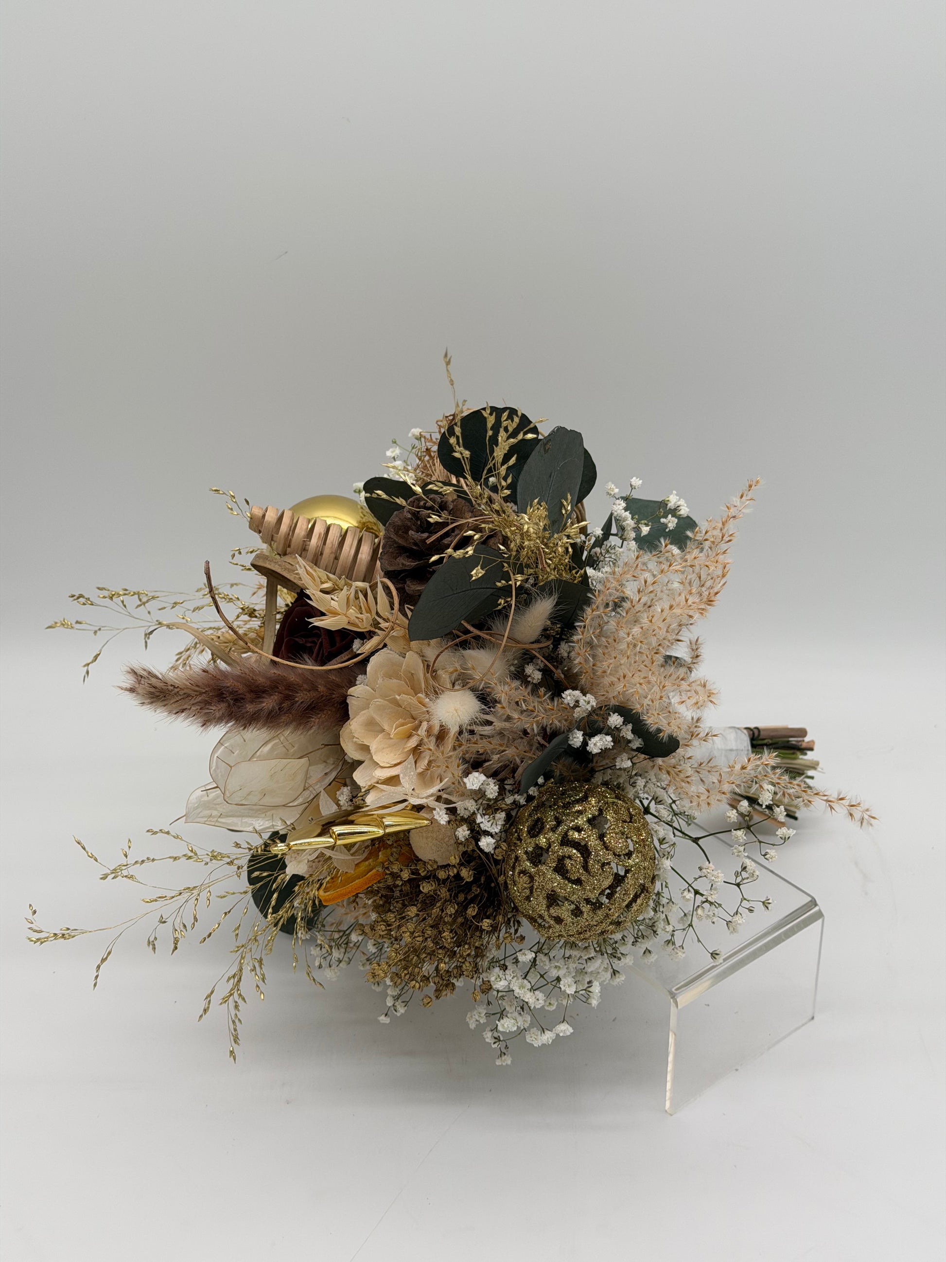Zeitlos moderner Strauß in warmen Farbtönen wie beige, braun und gold, bestehend aus verschiedenen Trockenblumen. Außerdem sind weihnachtlich Details, wie ein Weihnachtsbaum und Weihnachtskugeln integriert. Auch perfekt als kleine Aufmerksamkeit zum Adventsessen.