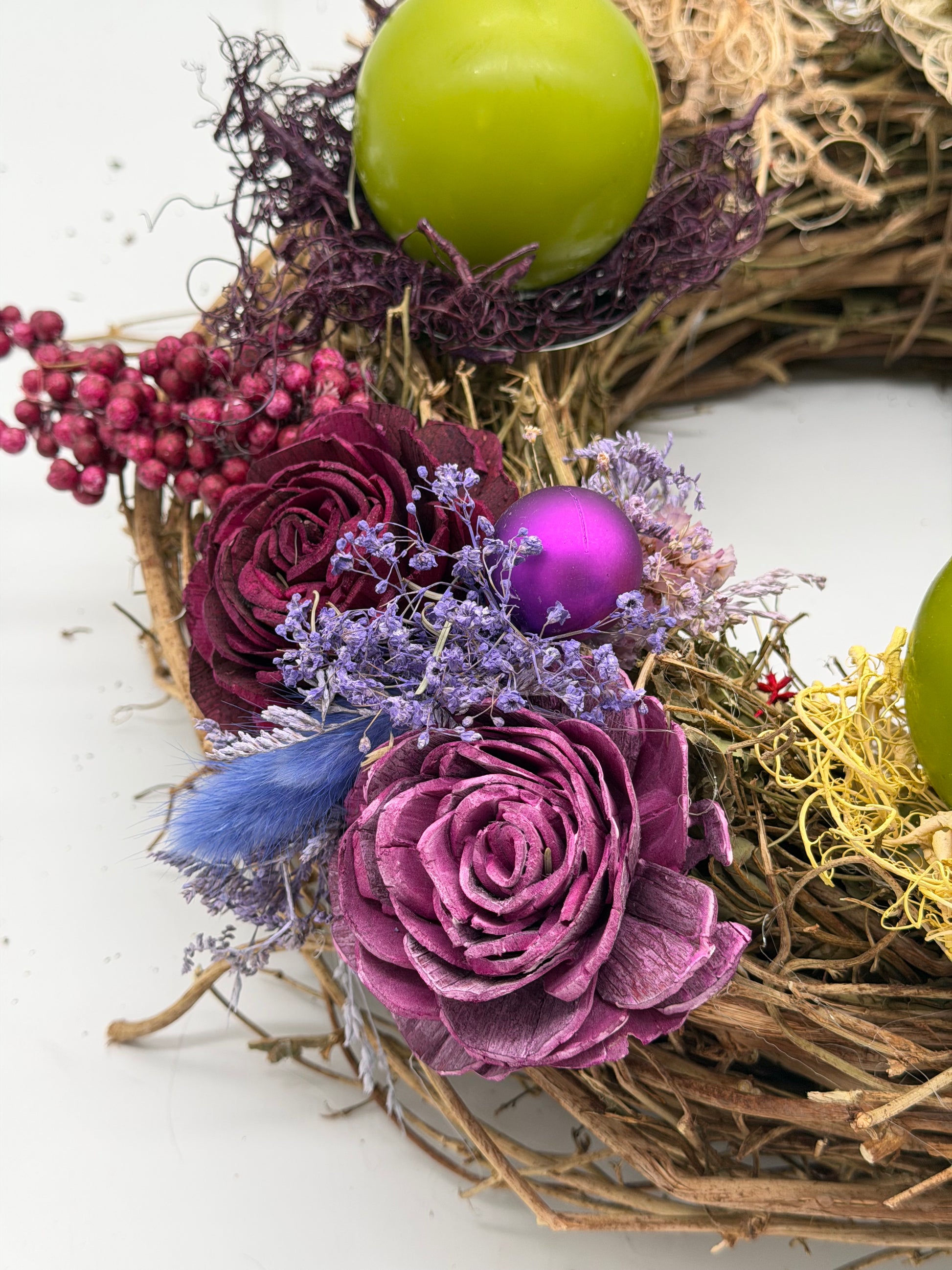 Feiern Sie die Adventszeit mit diesem haltbaren Adventskranz in bunten, aber gleichzeitig natürlichen Farben! Die Materialien sind langlebig und versprechen eine lange Freude am festlichen Kranz. Machen Sie Ihr Zuhause mit diesem einzigartigen Highlight besonders gemütlich und festlich.