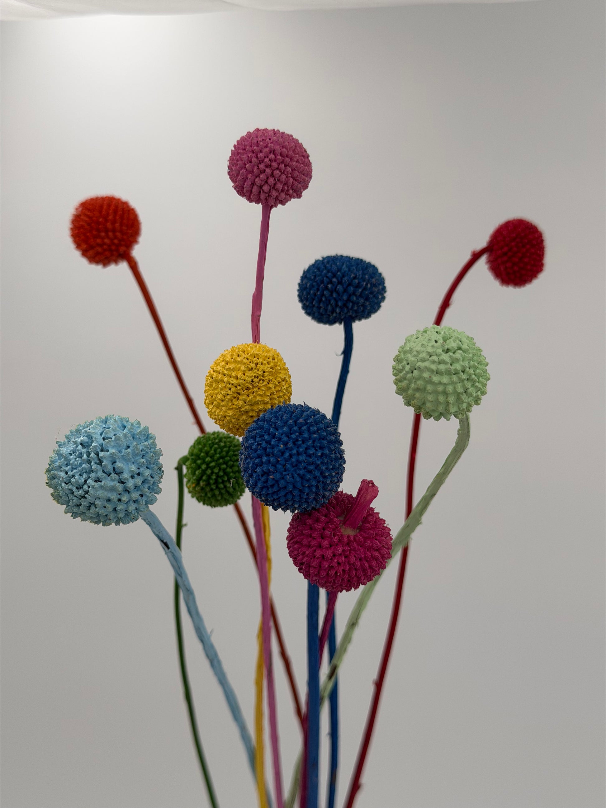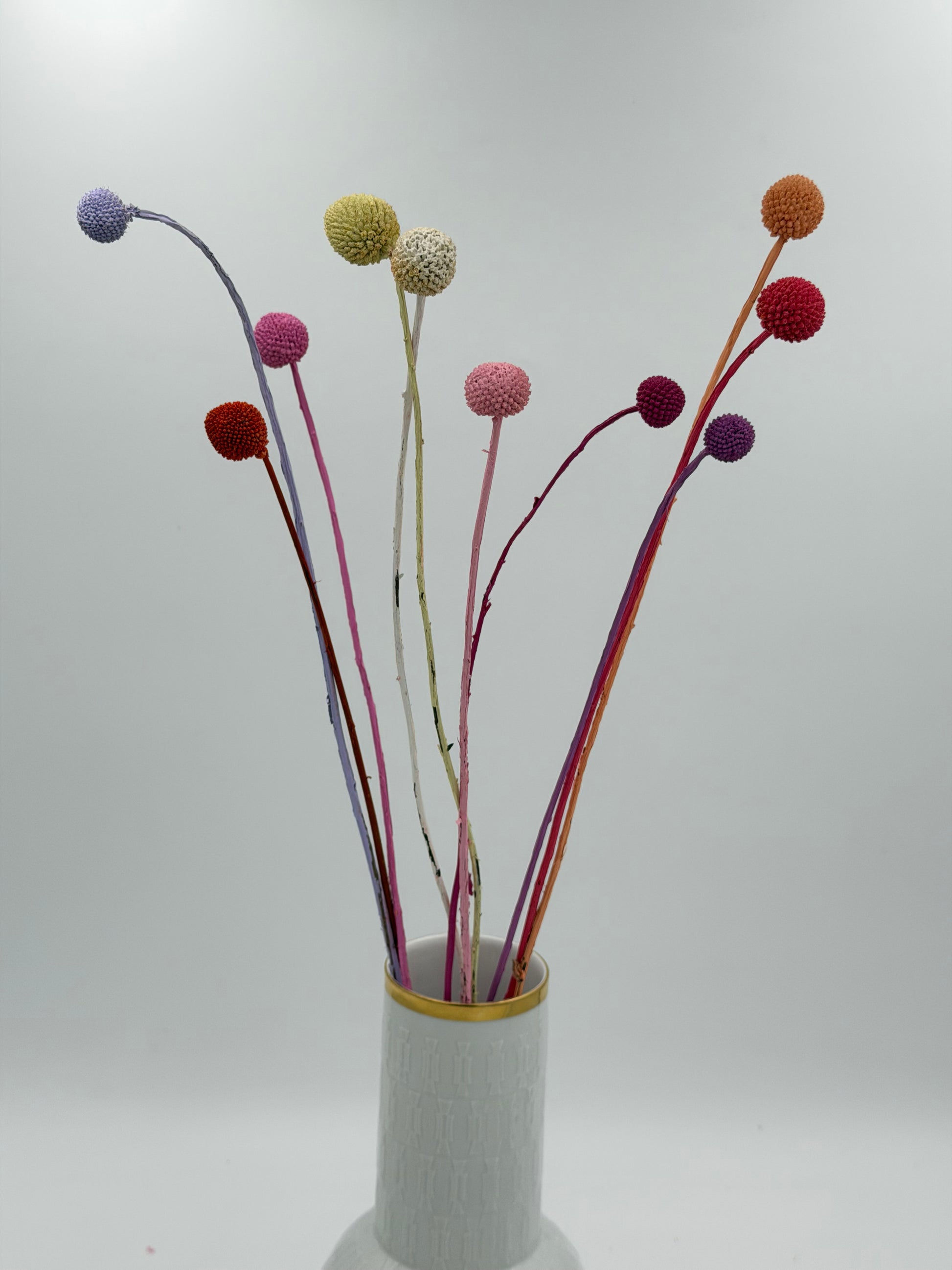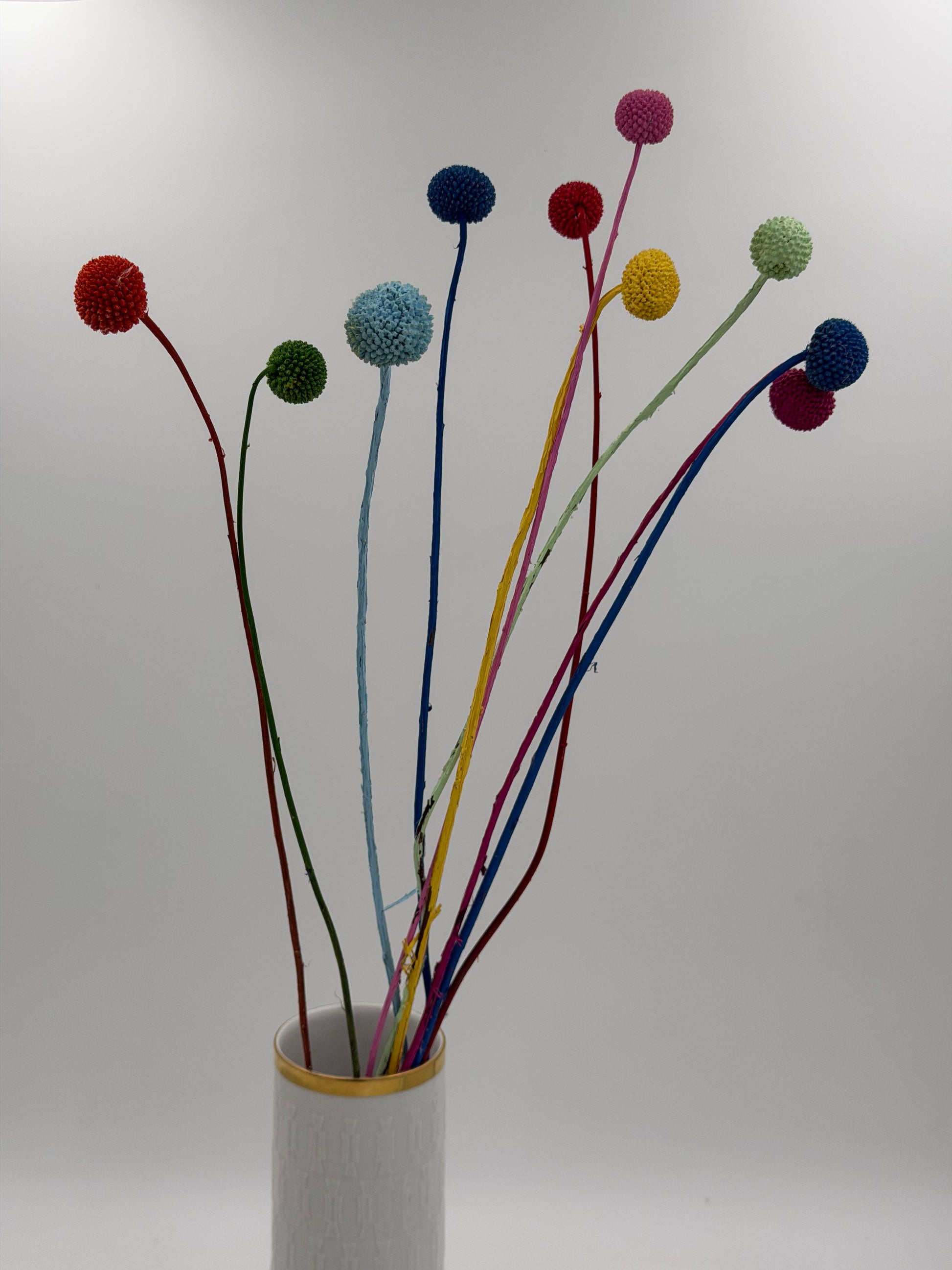 Craspedia sind kleine Kugeln an schlanken Stielen in auffälligen Farbtönen, welche sofort Fröhlichkeit versprühen. Außerdem schenken sie deinem Interieur direkt Charakter! Auch eine originelle Dekoration in Blumensträußen, Gestecken oder als Hingucker in einem Loop oder Türkranz.