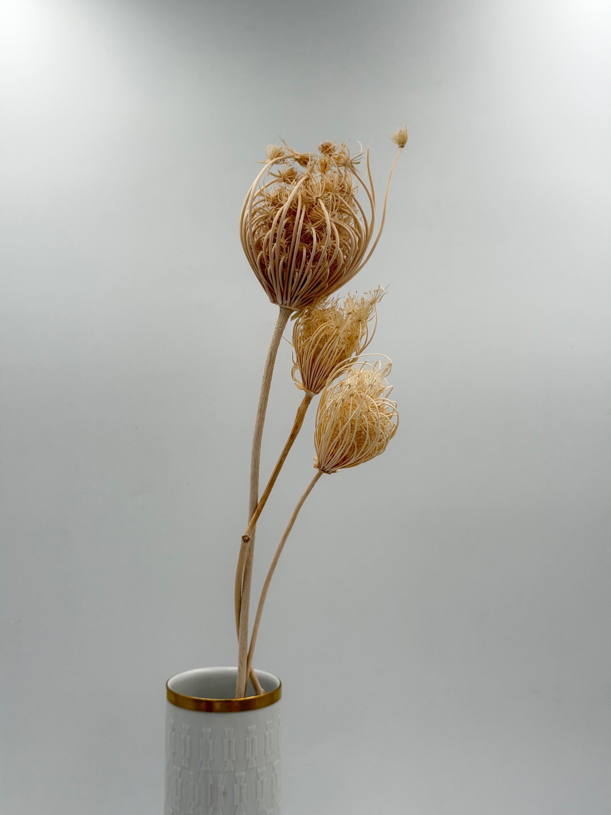 Der Fenchel ist eine besondere Trockenblume, mit relativ wildem, aber außergewöhnlichem Aussehen. Die Blüten sind dick und einzelen Fasern stehen wild ab. Dadurch wirkt er schon alleine in einer Vase sehr schön. Aber auch in Kombination mit anderen Trockenmaterialien ist er ein Eyecatcher.