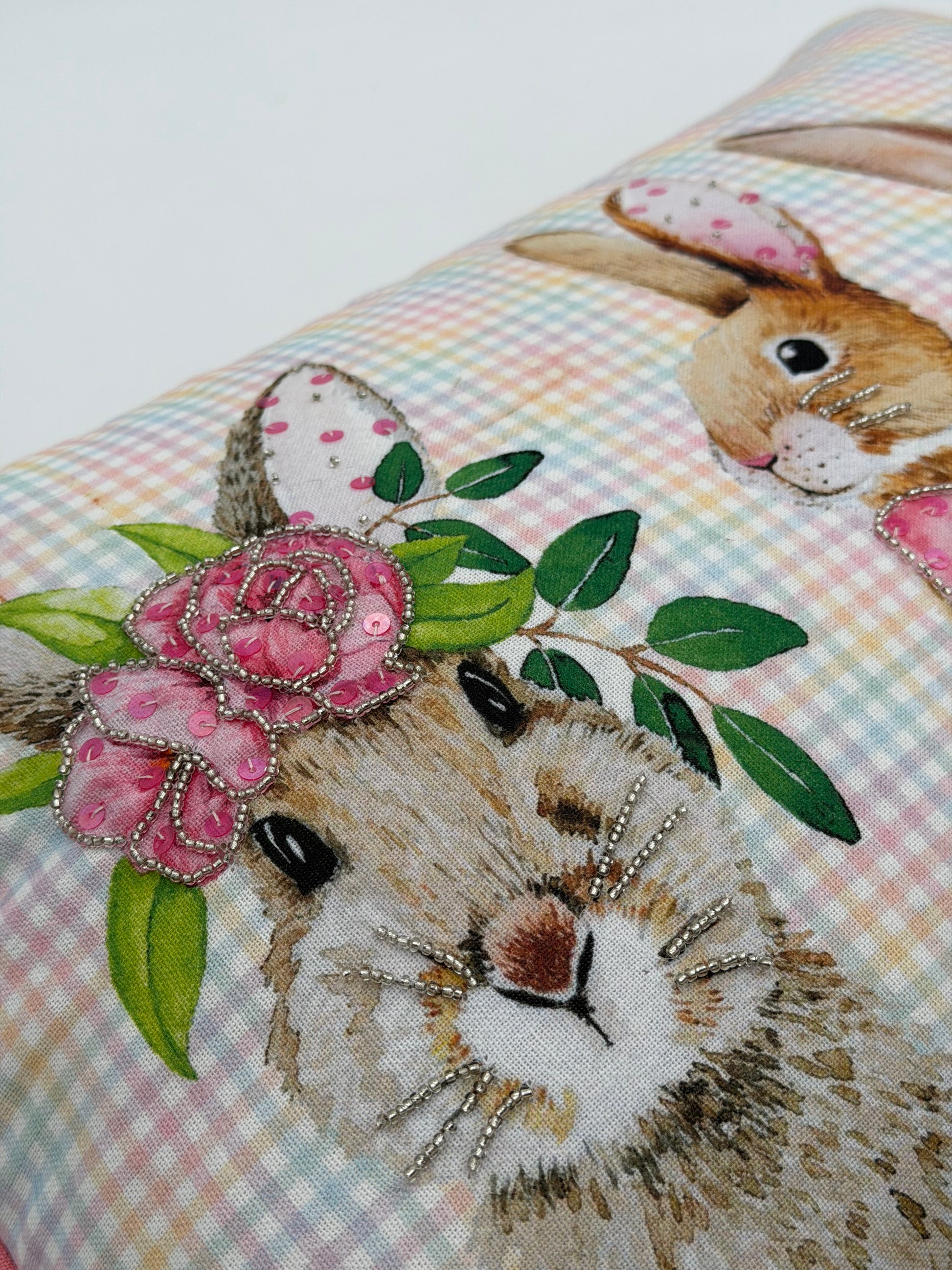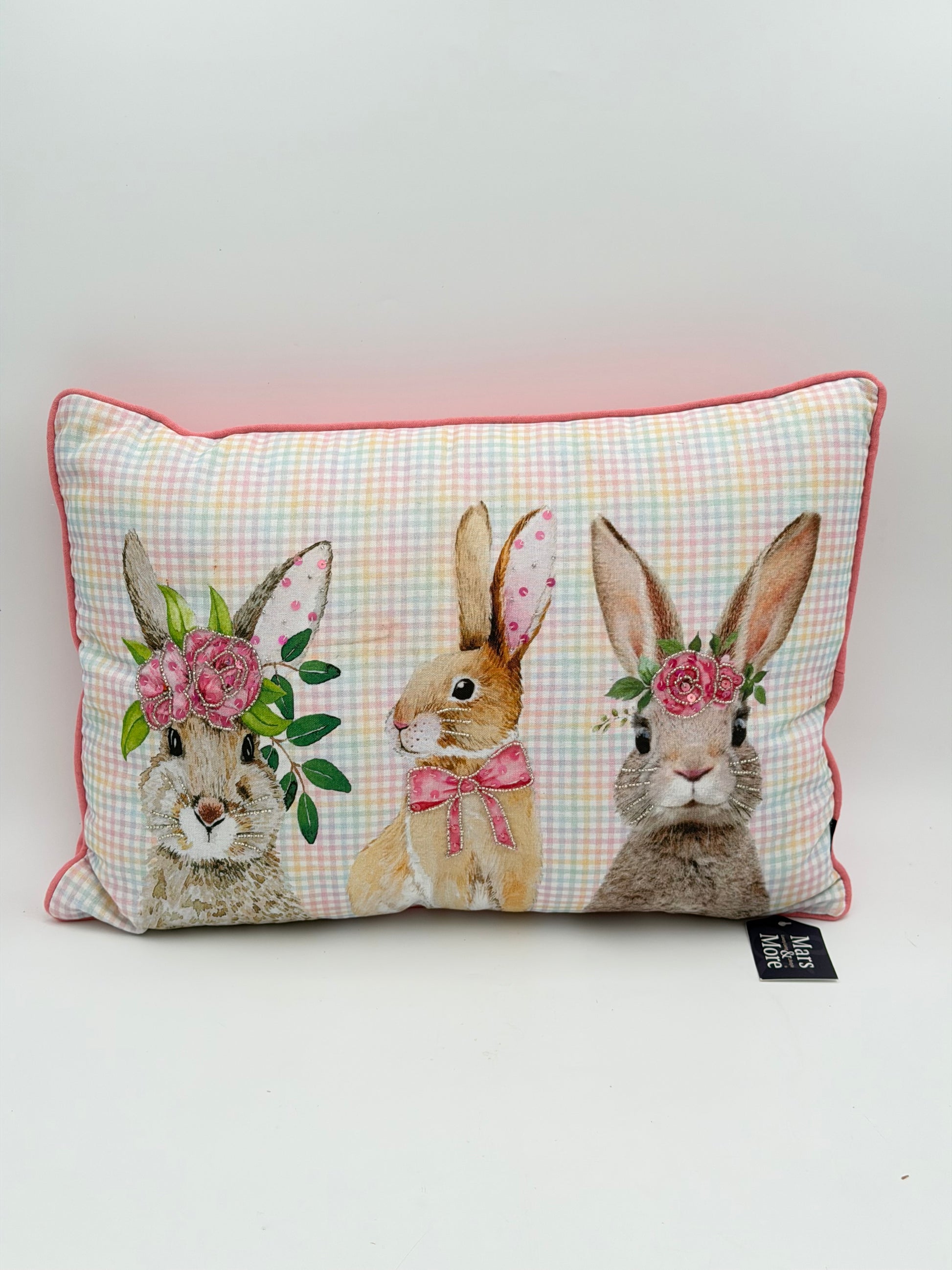 Drei süße Hasen schmücken die Vorderseite dieses Kissens von Mars & More. Die Blumen und Schnurrhaare sind teilweise mit Glitzersteinen und Pailletten verziert. Dadurch wirkt das Dekokissen sehr hochwertig und ist ein echter Hingucker auf jedem Sofa.
