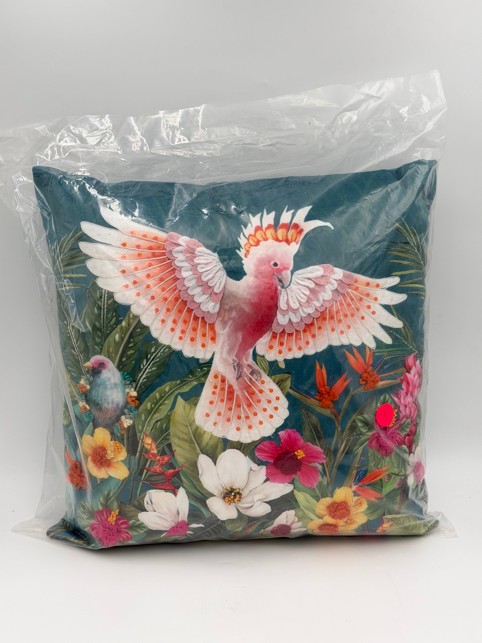 Ein Kakadu & ein weiterer Vogel schmücken die Vorderseite dieses Kissens von Mars & More. Einige Details, wie zum Beispiel die Blüten oder Flügel, wurden aufgenäht und sind deshalb hervorgehoben. Dadurch wirkt das Dekokissen sehr hochwertig und ist ein echter Hingucker auf jedem Sofa. Die Rückseite dieses Kissens hat dezente Palmenblätter aufgedruckt.