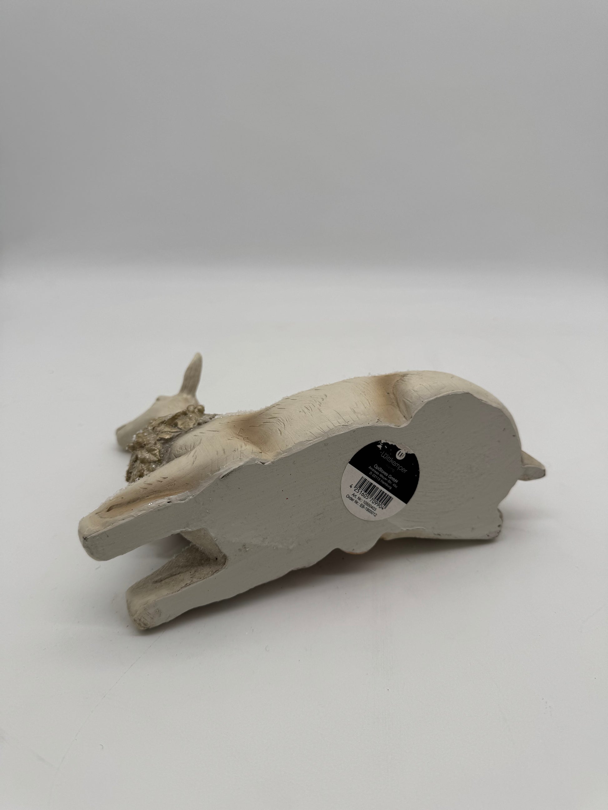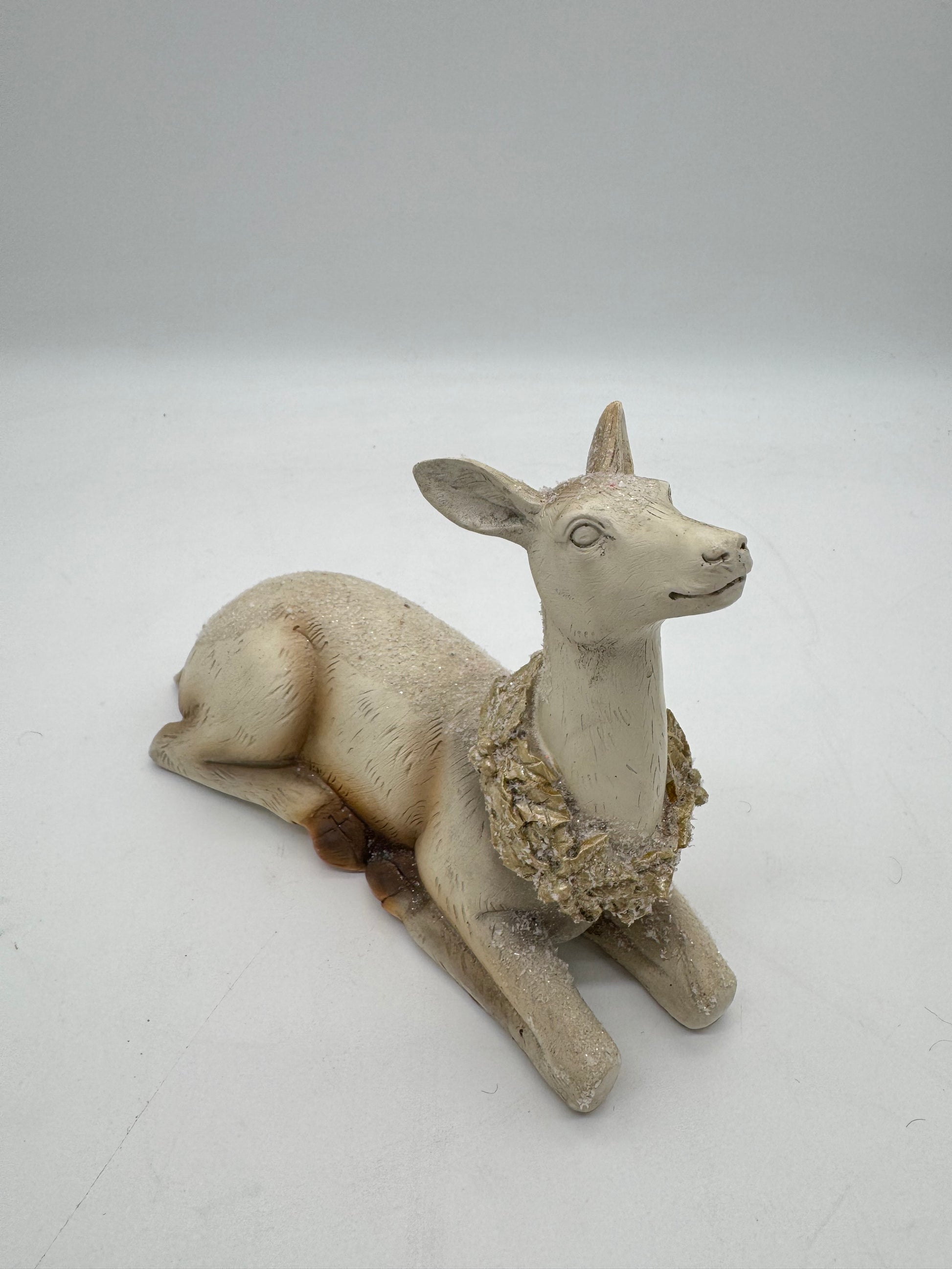 Liegendes Reh mit Halskrause und kleinen Glitzerflocken. Das Reh steht sehr stabil und ist relativ schwer. Einzeln ein Highlight, aber auch als Ergänzung für ein Gesteck.