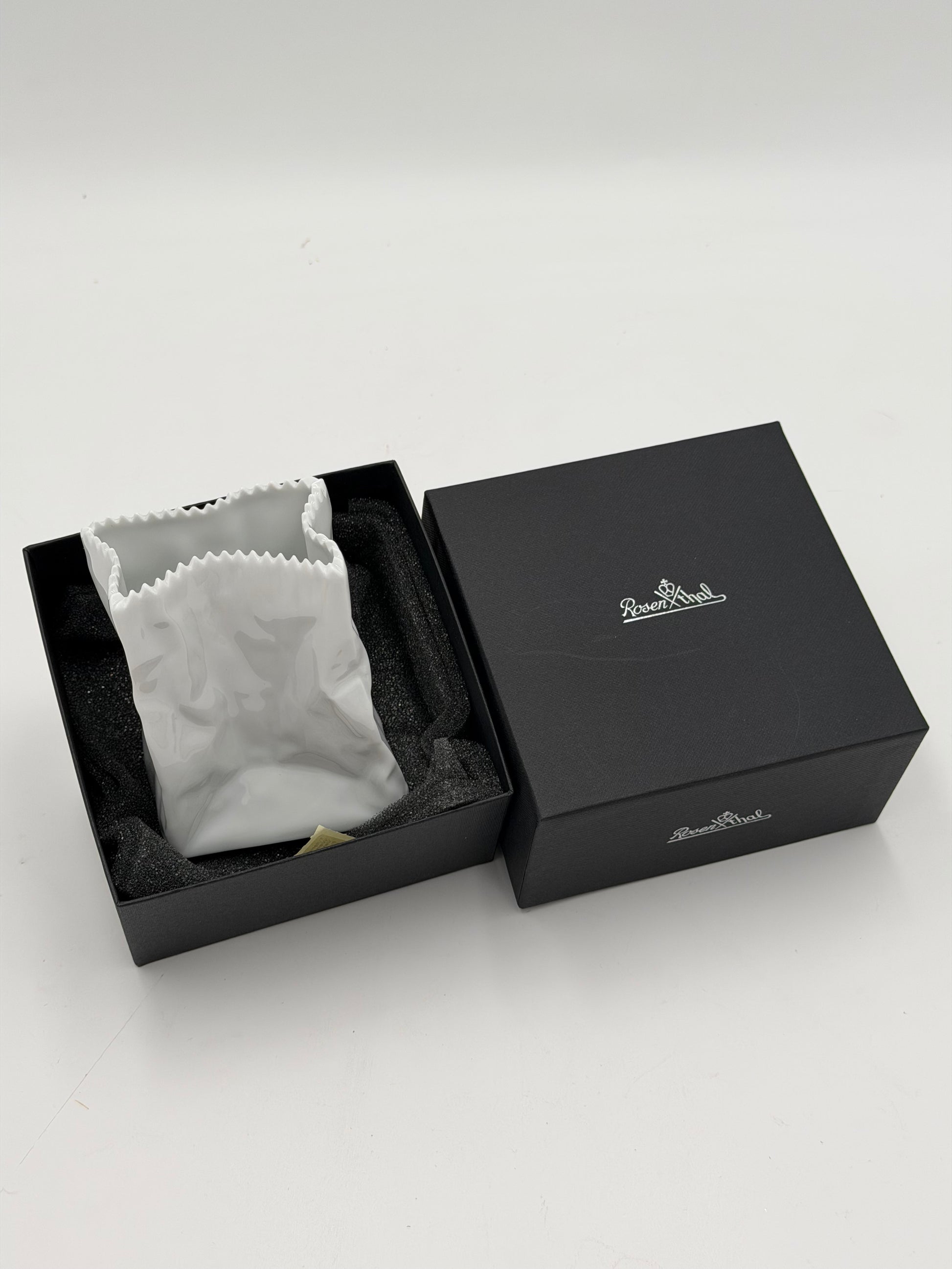 Außergewöhnliche Designvase aus dem Hause Rosenthal, inspiriert von der ikonischen Papiertüten-Form. Die glänzende, weiße Oberfläche mit organischer Struktur und der gezackte Rand machen diese Vase zu einem echten Blickfang - modern, minimalistisch und gleichzeitig verspielt.